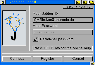 - Wir geben nun unter "Your Jabber ID" unsere Jabber ID ein, die wir gerne für uns beanspruchen würden. Ihr könnt dafür eueren Nicknamen wählen, gefolgt von einem "@Charente.de". In meinem Fall ist das: Cj-Stroker@Charente.de. Beachtet dabei, daß dies nur funktioniert, wenn der gewählte Nickname auf diesem Server noch nicht auf jemand anderes registriert ist.